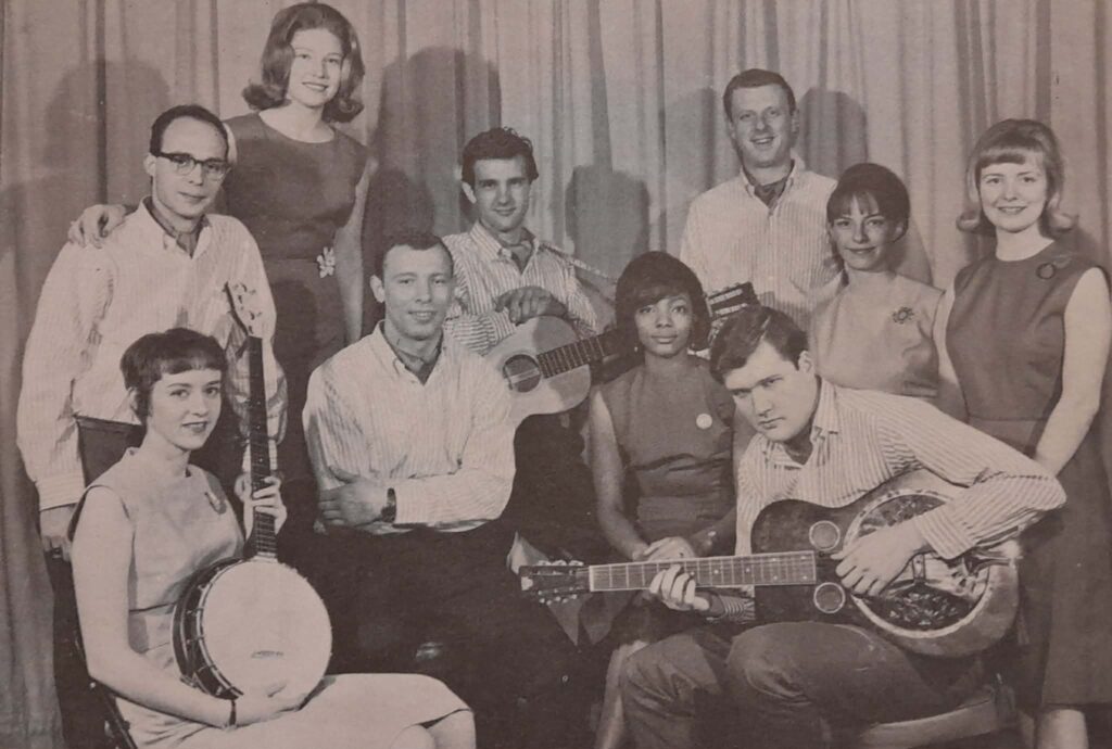 The singers and players of the Wisconsin Idea Theater: Standing: Hal Krider, Gail Mitchell, Kent Toepfer, David Peterson, Dee Lawrence, Santha Sarig; Seated: Joie Canada, Lynn Seibel, Klesie Kelly, John Juhl